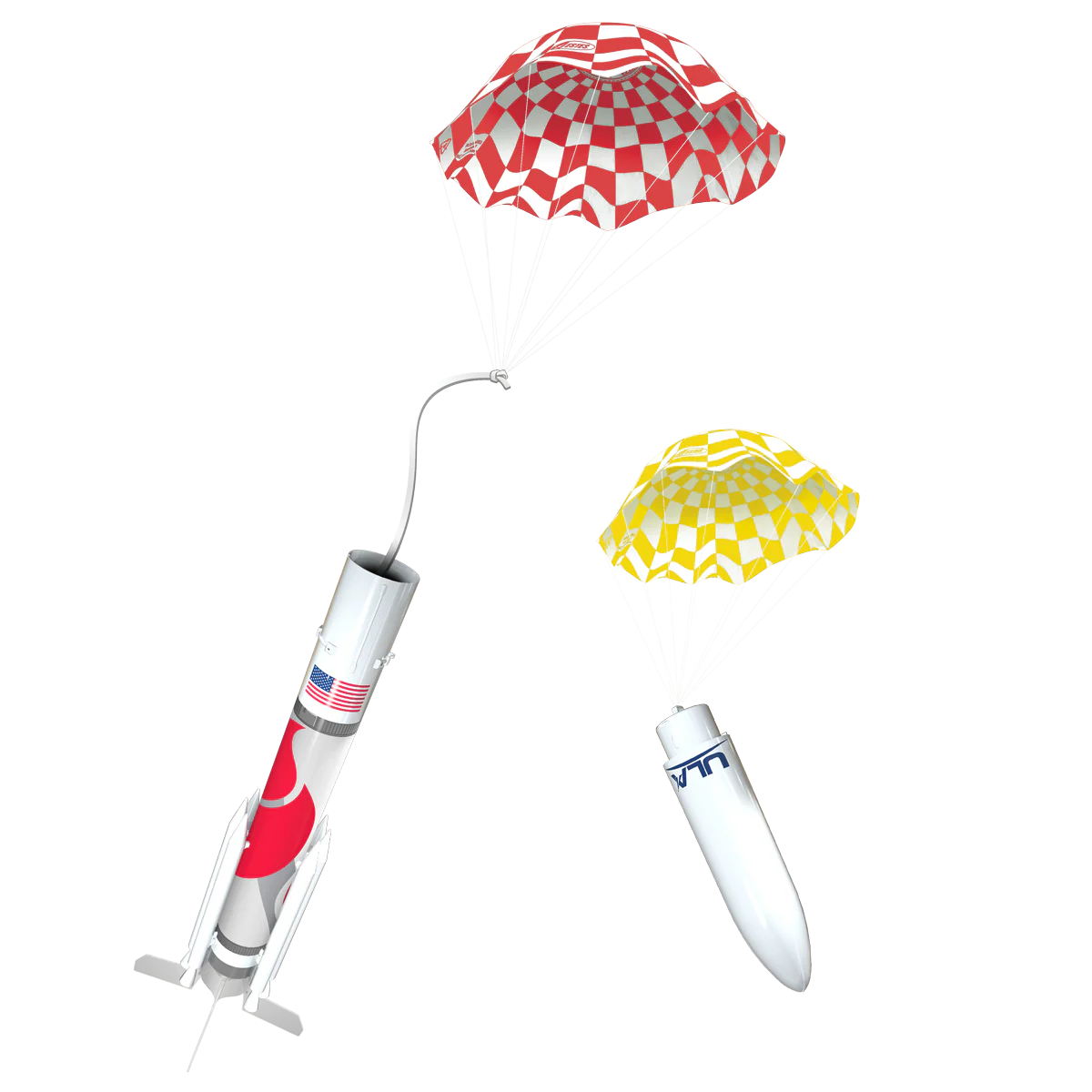 The ULA Vulcan features a uniquely engineered two-parachute recovery system that ensures both safety and spectacle. A 24-inch parachute gently lowers the main body of the rocket, while a separate 9-inch chute independently recovers the detachable nose cone. This staged descent not only adds realism to every launch but also improves landing stability and minimizes damage on touchdown.