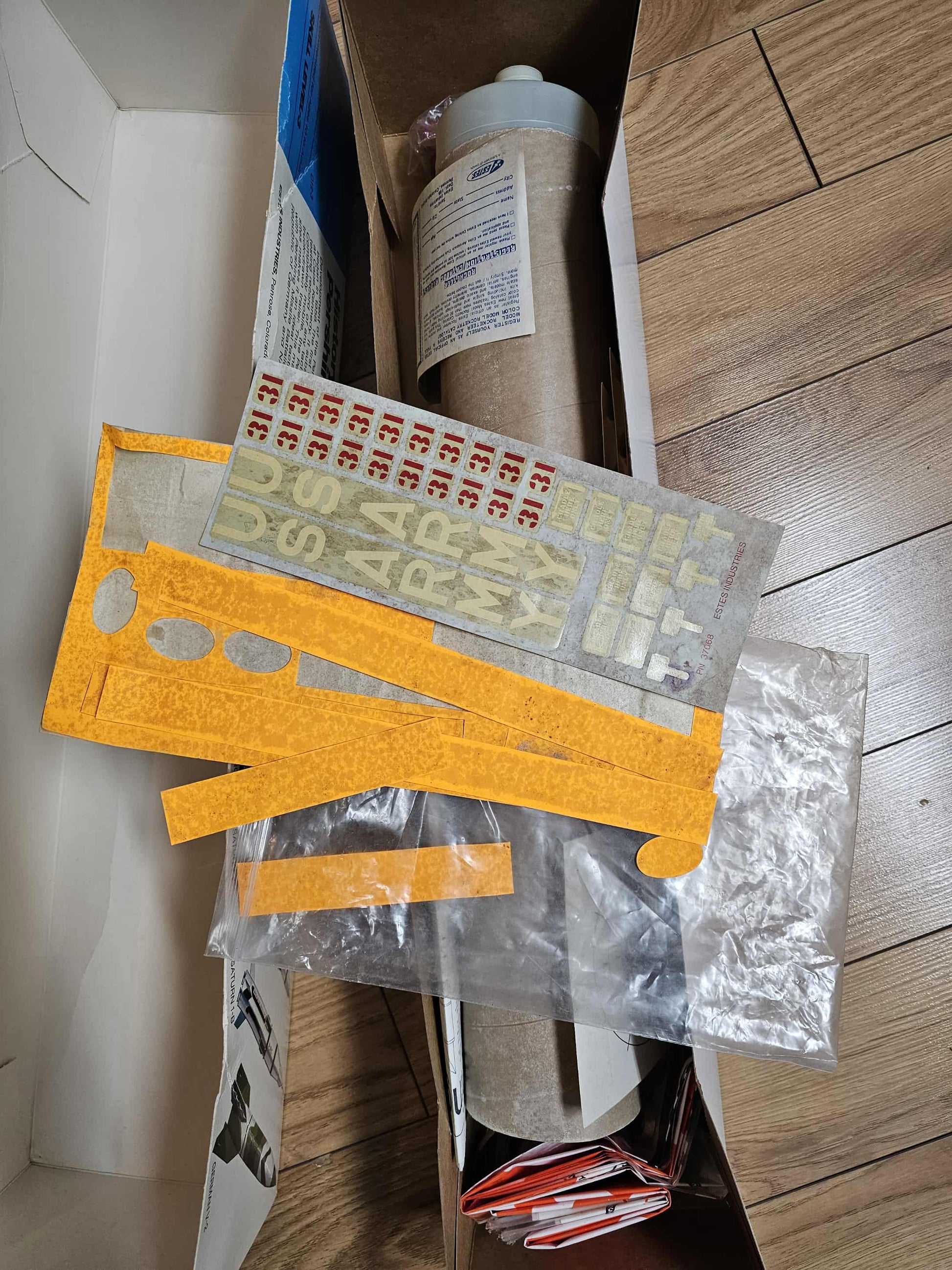 the kit is in great condition, the decals / stickers have not survived the test of times unfortunately, but they are available at this location : https://www.cmrproducts.com/Estes-Pershing-1A-Decals-p513508818
