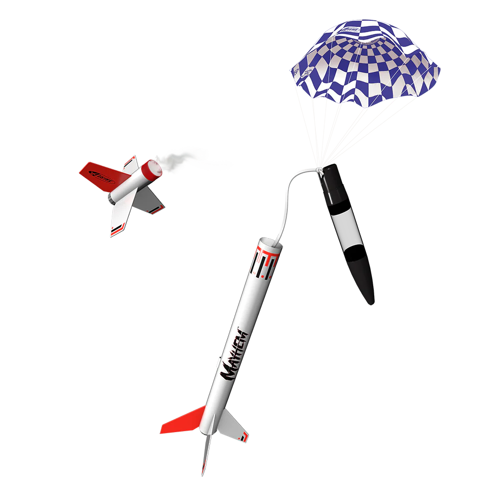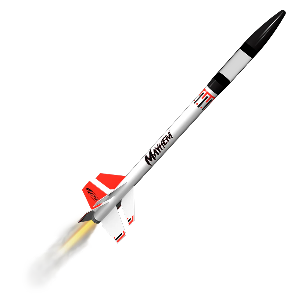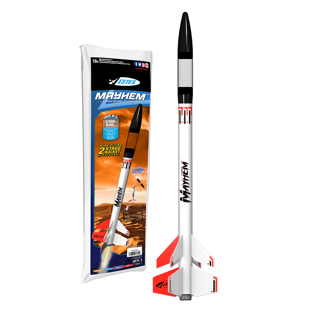 The Mayhem™ model rocket is built for serious altitude and serious fun. Designed for advanced rocketeers, this two-stage rocket can reach up to 2,100 feet and offers both single-stage and booster-assisted flight configurations. With a sleek profile, bold styling, and a clear payload section for experiments or altimeters, Mayhem™ is as versatile as it is powerful.